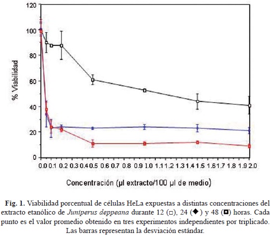 Se encontró que los extractos etanólicos de J. deppeana y de S. rostratum redujeron la viabilidad de las células HeLa, lo que significa que produjeron citotoxicidad. Respecto de J. deppeana, como se muestra en la figura 1, la pérdida de viabilidad se presentó a partir de 0.05 µl; extracto/100 µl de medio en los tres tiempos medidos, 12, 24 y 48 hrs. El tratamiento de 12 hrs produjo el menor decremento de la viabilidad y el efecto máximo se alcanzó en la concentración del extracto de 2 µl/100 µl de medio, mientras que a 24 y 48 hrs el decremento fue mayor. En el tratamiento de 24 hrs la reducción máxima de la viabilidad llegó a 25%, este efecto se alcanzó al aplicar 0.1 µl del extracto y luego se mantuvo estable; a 48 hrs la viabilidad se redujo hasta el 10% con 0.4 µl del extracto y en adelante se estabilizó. La pérdida de viabilidad celular dependió tanto de la concentración del extracto como del tiempo de exposición.