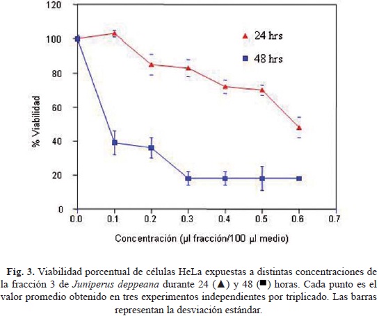 Se encontró que la fracción 3 (Rf = 0.28) de J. deppeana produjo una reducción de la viabilidad celular. Como se observa en la figura 3, esta reducción fue dependiente de la concentración y del tiempo de exposición. En el tratamiento de 24 hrs se observó un decremento continuo de la viabilidad hasta llegar a 48% con 0.6 µl fracción/100 µl medio, la concentración más alta ensayada. En el tratamiento de 48 hrs la viabilidad se redujo hasta 20% con 0.3 liI fracción/100 liI medio, desde donde se mantuvo estable. Las CI50 de la fracción se presentan en la tabla 1, donde se observa que los valores son de los mismos órdenes de magnitud que los del extracto completo a 24 y 48 hrs, por lo que se supuso que el compuesto contenido en la fracción 3 le confiere las propiedades citotóxicas a J. deppeana.