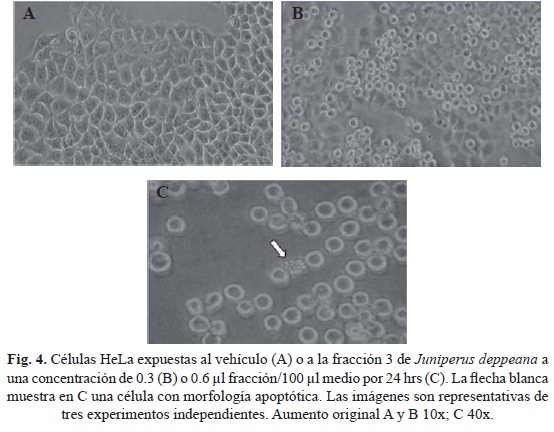 En la figura 4 se presentan las imágenes obtenidas al microscopio de los cultivos de las células HeLa testigo expuestas al vehículo (etanol) (A) y al exponer el cultivo a la fracción 3 de J. deppeana durante 24 hrs a una concentración de 0.3 (B) y de 0.6 li! fracción/100 li! medio (C), en ambas imágenes se observan células con forma redonda y en la última algunas con núcleos fragmentados y protuberancias celulares.