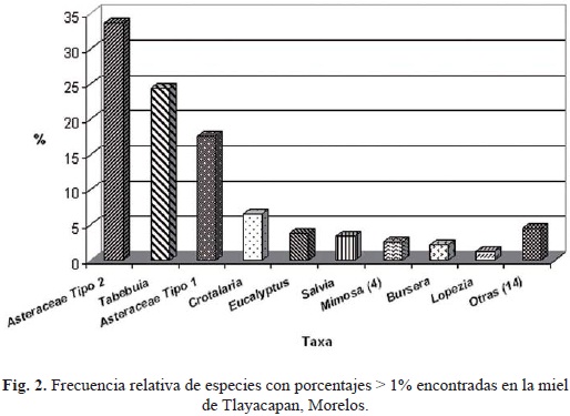 Para la miel de Tlayacapan, se determinó el polen de 23 especies de plantas. Los taxa más abundantes son: Tabebuia (24.35%), las asteráceas tipo 1 (17.56%) y tipo 2 (33.73%). Además, se registraron 20 especies melíferas con bajas proporciones (Figs. 2 y 3).