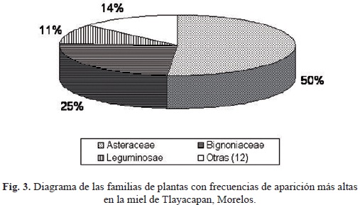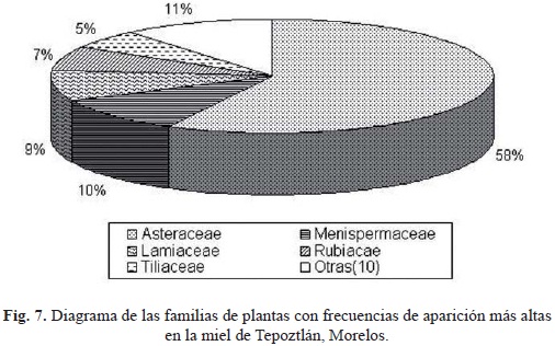 En las tres mieles, la familia Asteraceae estuvo bien representada tanto en número de especies como en frecuencia de aparición, lo cual concuerda con lo que señalan algunos autores de que Asteraceae es una de las familias más grandes, que comprende la décima parte de todas las plantas conocidas, con numerosas especies nectaríferas y poliníferas (Ordex et al., 1972). En el estado de Morelos, esta familia cuenta con 127 géneros y cerca de 447 especies (Bonilla-Barbosa y Villaseñor op cit.), encontrándose grandes poblaciones de individuos de los géneros Cosmos, Bidens, Senecio y Tithonia.