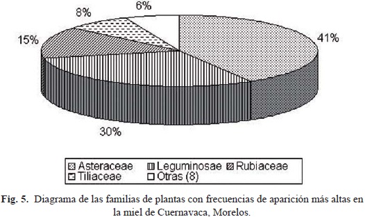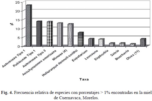 En la miel de Cuernavaca se encontró polen de 22 especies de plantas diferentes, las más importantes son: dos tipos de Asteraceae (23.06% y 13.75%), Aeschynomene americana (12.98%), Mimosa (4) (12.4%) y una Rubiaceae (13.95%). Polen de 17 taxa diferentes se encontraron en bajas cantidades (Figs. 4 y 5).