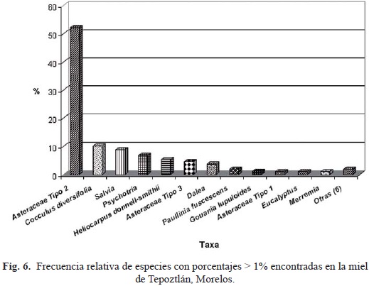 En la miel de Tepoztlán se tuvo el menor número de taxa (18) y sólo fueron de importancia una Asteraceae (52.2%) y Cocculus diversifolia (10.2%). El resto de las especies (16) se presentaron en bajas cantidades (Figs. 6 y 7).