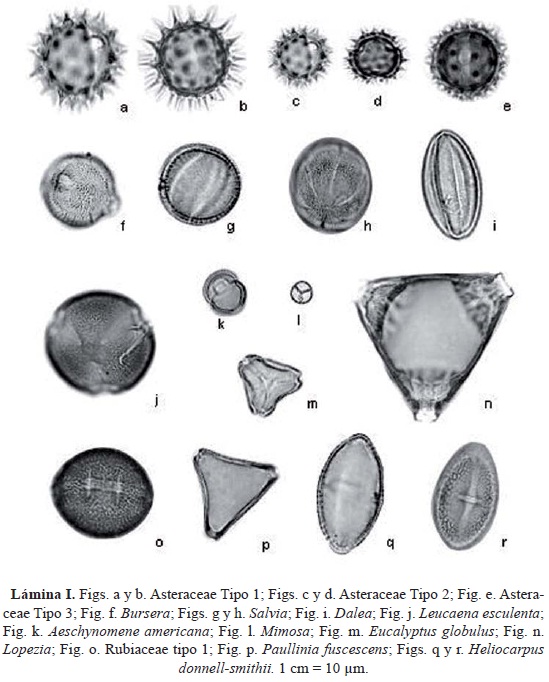 Con relación a las Leguminosae, se determinaron varias especies de esta familia, sobre todo en dos de las mieles (Tlayacapan y Cuernavaca, con seis y cinco especies respectivamente); sin embargo, estos taxa en la mayoría de los casos son poco abundantes. Sólo en la miel de Cuernavaca el polen de Aeschynomene americana y Mimosa (4) tiene una representación apenas superior al 10%. Esta familia es la segunda mejor representada en la flora fanerogámica de Morelos (Bonilla-Barbosa y Villaseñor, 2003).