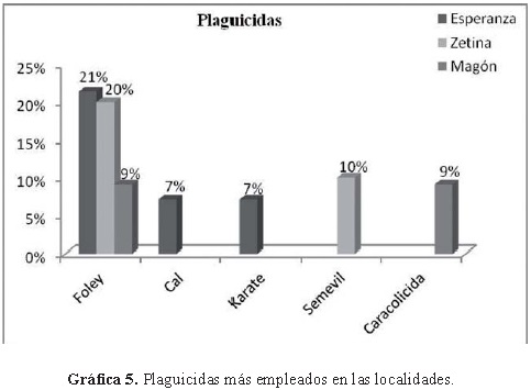 No obstante, los métodos químicos para el control de plagas son los más empleados en las tres comunidades. El producto comercial más utilizado con este fin es el Foley (gráfica 5), un plaguicida organofosforado que actúa por contacto e ingestión y se encuentra catalogado como altamente tóxico. El uso de los plaguicidas ha sido la técnica más utilizada para el control de muchas plagas (como Diatraea lineolata, Spodoptera frugiperda y Helicoverpa zea), sin embargo, su aplicación y uso reiterado ha provocado que los insectos benéficos también sean eliminados, tales como los polinizadores (abejas, abejorros, sírfidos y escarabajos) y enemigos naturales de los insectos plaga (parasitoides y depredadores). Los campesinos de estas comunidades desconocen los métodos de control biológico para eliminar plagas, por lo que manifiestan estar interesados en recibir asesoría sobre el tema.
