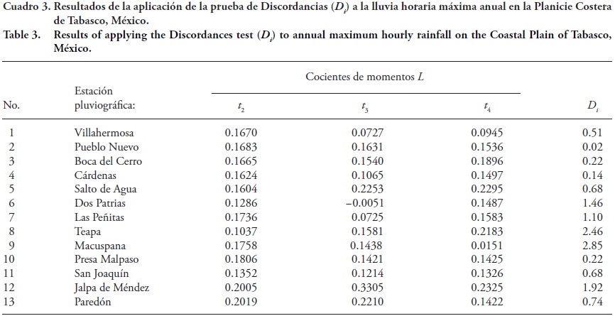Antes de realizar los análisis probabilísticos de la lluvia horaria se debe buscar valores erróneos, eventos dispersos, tendencia y saltos o cambios en la media de tales datos, los cuales se reflejan en los momentos L de cada muestra. La prueba de Discordancias (Hosking y Wallis, 1997; Campos, 2010b) usa los cocientes L de momentos para detectar sitios que son discordantes con el grupo como un todo. Según los resultados de la aplicación de la prueba de Discordancias (Cuadro 3), hay cuatro registros que se pueden considerar anómalos debido a su valor alto del estadístico Di o discordancia con el grupo: Macuspana (Di=2.85), Teapa (Di=2.46), Jalpa de Méndez (D1 = 1.92) y Dos Patrias (Di= 1.46). Por lo tanto sólo se procesarán los nueve registros restantes.