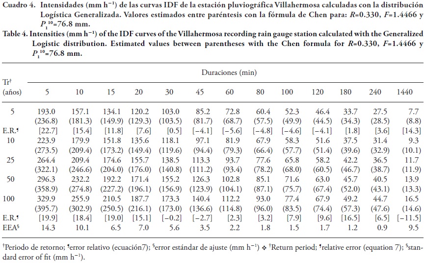 Las series de intensidades máximas anuales en las 12 duraciones estándar de las estaciones pluviográficas Villahermosa, Pueblo Nuevo y Boca del Cerro, las de más amplio registro y representativas de los pisos de altitud, fueron analizadas probabilísticamente cada una con uno de los modelos usados para procesar las lluvias horarias. En el Cuadro 4 se muestran los resultados para la estación pluviográfica Villahermosa y corresponden a las curvas IDF, construidas con base en sus registros de intensidades disponibles. Las intensidades para la duración de 1440 min se calcularon dividiendo entre 24 las predicciones P24Tr (Paso 1), obtenidas con base en las predicciones diarias para el modelo probabilístico usado.