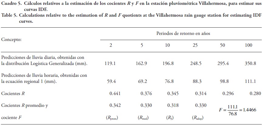 En el Cuadro 5 se muestran los cálculos relativos a la estimación de los cocientes R y F, en la estación pluviométrica Villahermosa, usando sus predicciones de lluvia diaria y la ecuación 1.
