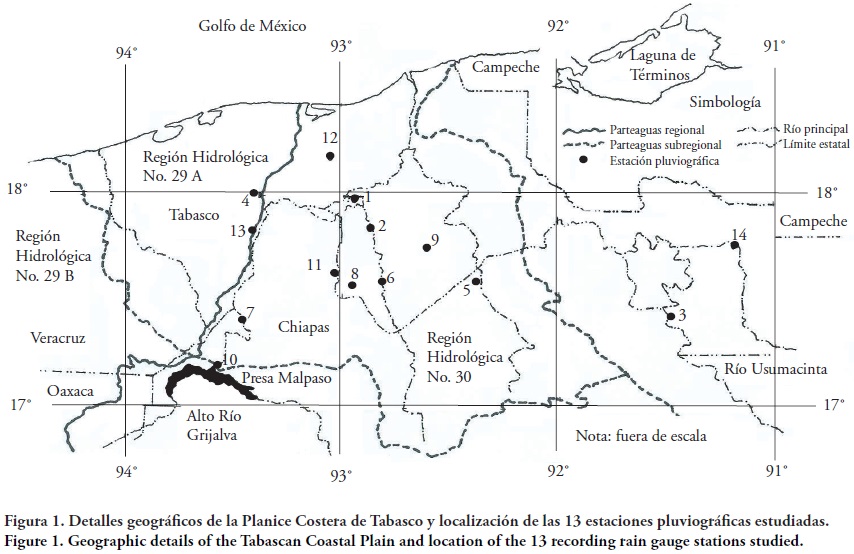 La planicie costera de Tabasco está integrada por la subcuenca del río Tonalá y Lagunas del Carmen y Machona que pertenecen a la Región Hidrológica No. 29 (Coatzacoalcos) y por las subcuencas bajas de los ríos Grijalva y Usumacinta que forman la Región Hidrológica No. 30. Hacia el sur, la planicie citada tiene su zona montañosa la cual colinda con la subcuenca del alto río Grijalva definida por el parteaguas de la Presa Netzahualcóyotl (Malpaso). En la planicie costera de Tabasco y zona norte de Chiapas existieron 14 estaciones pluviográficas con pluviómetros (Figura 1).