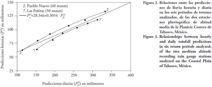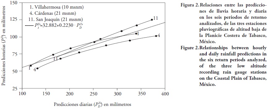 El análisis probabilístico de las series de máximos anuales, de la información pluviográfica de una hora de duración y de la pluviométrica relativa a la máxima diaria, permite obtener sus predicciones asociadas a seis periodos de retorno (Tr) de diseño. Con esas predicciones (P1Tr y PDTr), en la Planicie Costera de Tabasco, México, se encontró una relación lineal entre ellas, función de la altitud; esto se verifica por una pendiente mayor de la recta de regresión conforme la altitud crece.