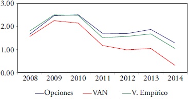 The comparison of the values of theoretical models with the empirical value observed, in other words, the value reached in the market every year of the period, showed that the value obtained with the methodology of real options was readjusted with greater precision to the empirical value observed in the market between 2008 and 2014 than the discounted cash flow method, which underestimated the value of the exploitation, since it did not consider the value of the option of temporary abandonment. Although the methodology of options did present an overestimation of the real value of the opportunity to exploit the resource, the traditional methods did underestimate it further (Figure 1).