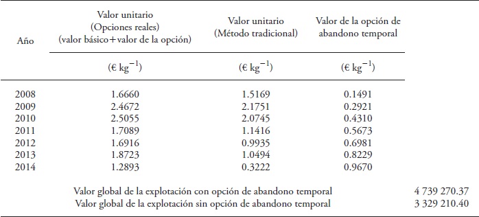 The difference between each of the real options described lies in their expiry dates (j=1, 2, 3,..., T), moment 1 being the year 2008, and moment T, the year 2014. The value of the exploitation per unit of output was calculated using equation (8) and the global value of the exploitation, using equation (9):