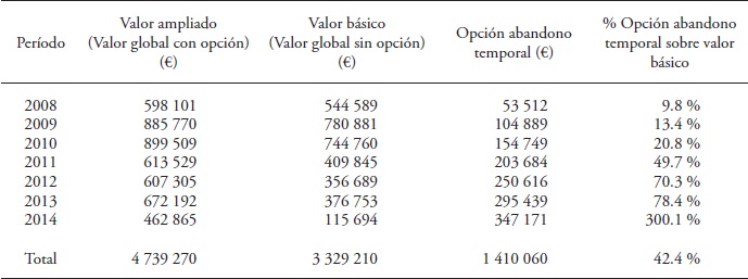 The results showed that the option of temporarily abandoning hake fishing activities meant an additional value of 42.4 % of the cash flows generated by its exploitation. This value is extremely important, since its disregard could give way to the rejection of investment feasible projects if flexibility in its management is considered, and particularly the temporary suspension of activities. Analyzing each period, it was possible to notice that as the temporary horizon of the exploitation increased, the percentage representing the option of temporarily abandoning operations also increase on the current value of the cash flows, since the uncertainty regarding the price of the fishery resource was higher (Table 2).
