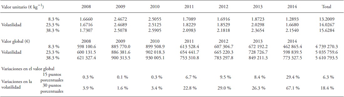 In the particular case analyzed, a higher price volatility for hake led to a higher value for exploitation between 2008 and 2014, or in other words, a greater uncertainty related to the price of the fishery resource did not mean a reduction but a generation of value (Table 3). Similar results were obtained by Alonso et al. (2005) for forestry exploitations.