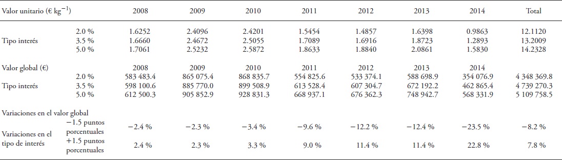 Regarding the risk-free interest rate, the theory of valuation of options foresees a positive relation between this variable and the value ofthe option, since a rise in the interest rate exerts a negative influence on the current strike price, having a positive effect on the value of the option to purchase (Fernández and García, 1992). The sensitivity analysis showed that the higher the value of the risk-free interest rate, the higher the value of the opportunity of exploitation, and therefore increases in the latter were related to increases in the expected profitability, final cause for the generation of greater value for fish exploitation (Table 4). This result is common in literature on options (Murillas, 2004). In particular, based on an average scenario in which the risk-free interest rate was 3.5 %, we could see that the 1.5 % variation in the rise of the interest rate meant an increase in the value of the exploitation of 7.8 %, whereas an equivalent reduction in the interest rate reduced the value of the exploitation by 8.2 %.