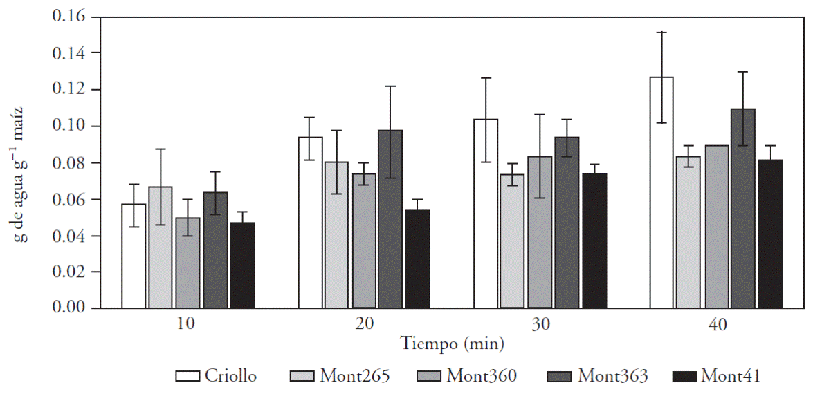 The variety that absorbed more water was the Criollo, contrasting with Mont41 and Mont360 that absorbed less (Table 3). However, the variety that absorbed more water at the beginning was Mont265 (Figure 2) which had a larger pericarp area per weight unit (Table 2). Despite this, the grain tended to stop absorbing water after 20 min, which can be due to its small size that led to its rapid saturation with water. The Criollo variety absorbed water for a longer time because, according to the flotation index and thousand kernel weight, the Criollo is a soft grain with greater porosity which allowed absorbing water even up to 40 min. The Mont363 variety had a similar behavior. The varieties Mont41 and Mont360 absorbed less water although their rate of water absorption was intermediate in relation to other varieties. Bressani (2008) indicated that the grain hardness is a variable linked to water absorption, because in corn varieties with higher content of hard endosperm starch granules are covered in a protein matrix, and the endosperm is more compact, which hinders water absorption.