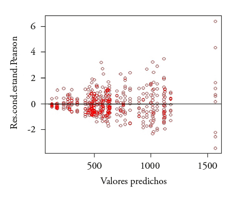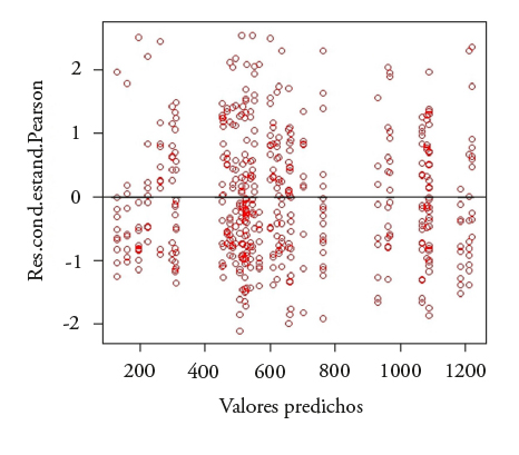 Figure 4 Distribution of predicted values as a function of the standardized residuals of Pearson with a model that contemplates distinct variances for each population.