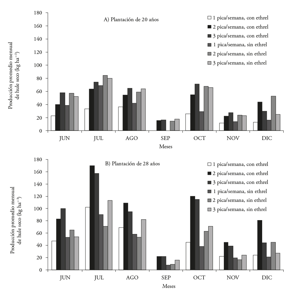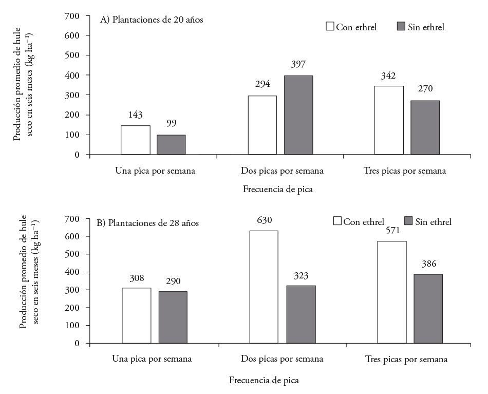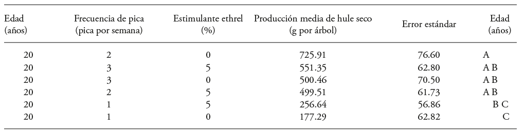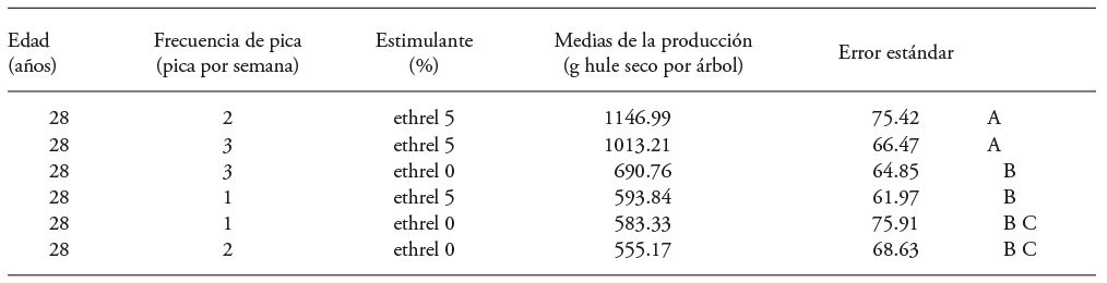 En las plantaciones de hule (Hevea brasiliensis Müell. Arg.) el tallo del árbol se divide para su aprovechamiento en partes longitudinales simétricas, denominadas “tablero de pica”. El tablero bajo inicia a 1.0 m sobre el nivel del suelo, en forma descendente y el tablero alto a 1.5 m sobre el suelo, en forma ascendente. En México las plantaciones se aprovechan por 25 años, pero el 30 % de ellas puede aprovecharse más tiempo, usando el tablero alto. Para estas plantaciones se aplica el corte de los vasos laticíferos (pica) ascendente en el tablero alto para alargar el ciclo productivo del árbol. El objetivo de este estudio fue conocer la producción de hule del tablero alto en plantaciones en edad productiva, estimulando con ethrel al 5 %, en tres frecuencias de pica, una, dos o tres por semana. La hipótesis fue que aplicando pica ascendente en tablero alto con estimulación de ethrel se puede prolongar la vida útil de las plantaciones dado que hay buena producción. Los tratamientos fueron pica ascendente en cuarto de espiral cada seis días, una pica por semana (1/4 S ↑ d6 6d/7), cada tres, dos picas por semana, (1/4 S ↑ d3 6d/7) y cada dos, tres picas por semana (1/4 S ↑ d2 6d/7), estimuladas con ethrel, más las mismas frecuencias sin estimular como testigos. El diseño experimental fue parcelas divididas con una modificación en número de repeticiones del testigo, usando el material disponible, asignando al azar los tratamientos en cada parcela. Los datos se analizaron como modelo lineal mixto. Los rendimientos mayores (52 % más, respecto a la misma frecuencia sin estimular) se obtuvieron en plantaciones de 28 años en frecuencia de pica dos veces por semana estimulada con ethrel, y le siguió la frecuencia de pica tres veces por semana (32 % más, respecto a la misma frecuencia de pica testigo). En plantaciones de 20 años las frecuencias de pica dos y tres veces por semana, estimuladas con ethrel, no presentaron diferencias significativas con las mismas frecuencias de pica sin estimular.