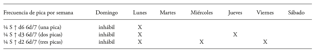 ¼ S ↑ d6 6d/7 = upward tap in quarter spiral every six work days; ¼ S ↑ d3 6d/7 = upward tap in quarter spiral every three work days; ¼ S ↑ d3 6d/7 = upward tap in quarter spiral every two work days. Six days a week are considered work days.