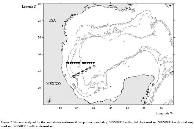 The elemental composition and distribution in the sediments can provide information on the deposit, current patterns and primary productivity conditions (Stein, 1990, 1991). The elemental composition in the Gulf of Mexico deep sediments follows a distribution similar to the phytoplanktonbiomass obtained with satellite images, with local differences attributed to continental inputs (Balsam and Beeson, 2003).