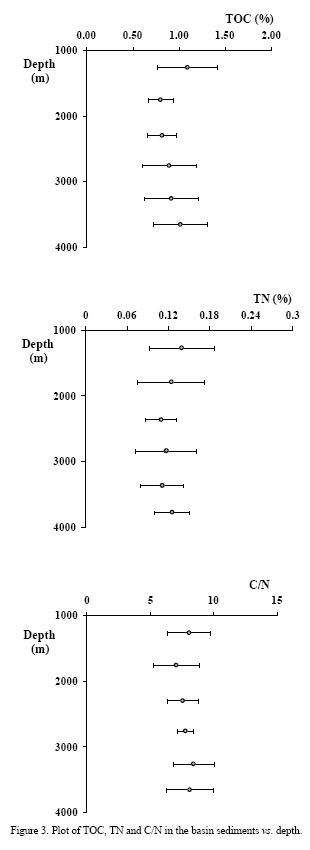 C/N increases in the world ocean with depth (C/Na 8 to 10 in Honjo et al., 1982). The sigmoidal pattern recorded in this study suggests a common origin, controlled by the sedimentation rate and by the preservation along the depth gradient, as reported in other regions (Suthhof et al., 2000).