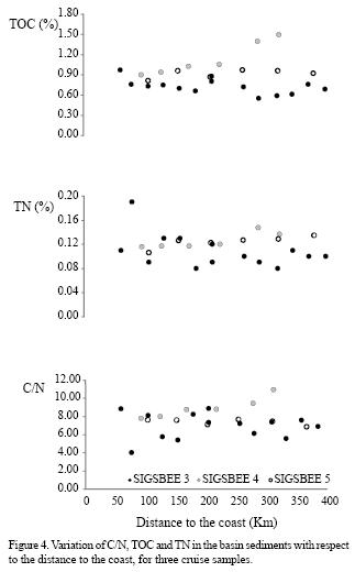 The terrigenous input from the coastal zone to the deep sea was evaluated on samples obtained along three transects from SIGSBEE cruises 3, 4 and 5 (Figure 2). The distance from the coast was determined with the DTCC 4.1 software. The Spearman correlation test allowed the evaluation of the change of TOC, TN and C/N ratios with distance from the coast.