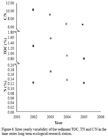The highest C/N was recorded in 2002 (10.3), the lowest in 2005 (6.6), and a diminishing trend in C/N is recorded with time (Figure 6). These differences adjust to a linear distribution (Spearman: R = 1, p = 0.01, r2 = 0.91, explaining 91% of the values).