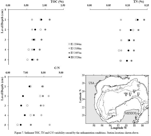 The local primary productivity, the preservation rate, and the input of continental organic matter are mechanisms that control the flux of organic matter in the sediment (Stein, 1991). The absence of a correlation of the TOC with depth in our study differs from the pattern previously recorded in the northern sector of the Gulf of Mexico (Morse and Beazley, 2008), in several regions of the world ocean (Suess, 1980) and inTN in the global seafloor (Fiitterer, 2000). Our results can be herein interpreted to be a consequence of bathymetric features (Mexican ridges, abyssal knolls) in the W and SW Gulf. These would have caused differences in the continental input and sediment transport, with minimum remineralization rates of organic matter recorded at 1,0002,000 m and increasing in the abyssal plain. A similar gradual increase was recorded at 2,0003,750 mby Morse and Beazley (2008) in the northern Gulf, decreasing with depth, in a similar way as the quartzfree fraction described by Müller and Suess (1979) in offshore sediments.