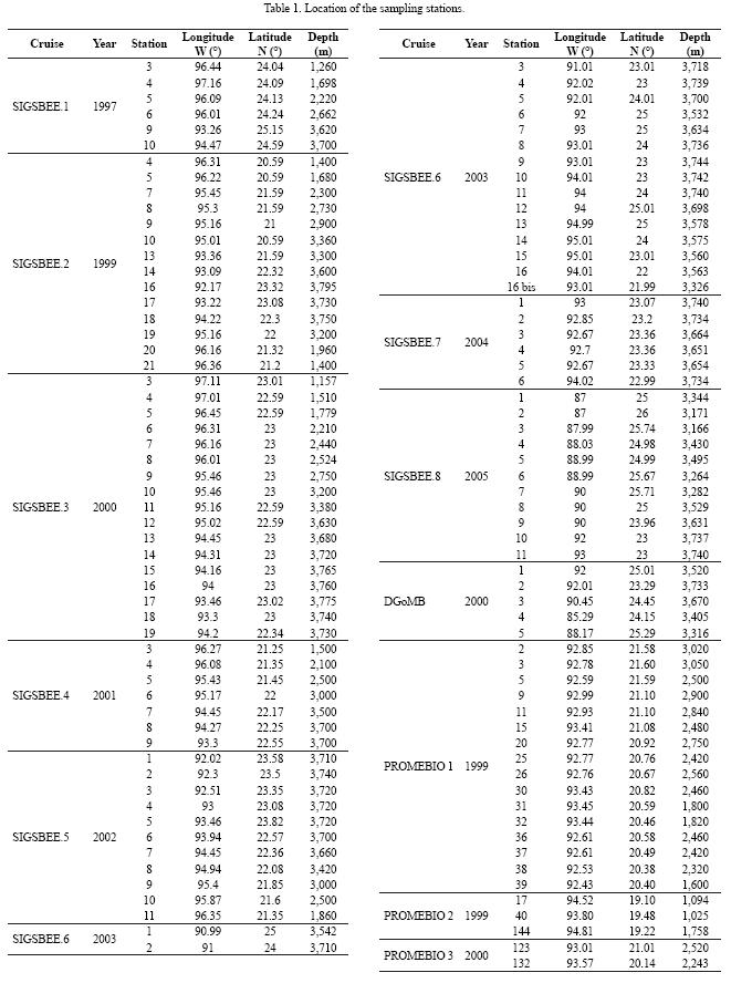 Superficial sediment samples were collected at a depth range of 1,025 to 3,750 m onboard UNAM's R/V Justo Sierra (SIGSBEE.1 to .8; PROMEBIO.1 to .3 cruises) and TAMU's R/V Gyre (DGoMB cruise) in the summer of years 1997 to 2005 (Figure 1, Table 1). The samples were collected from the top 5 cm of sediments, with a USNEL boxcorer during the SIGSBEE. 1 to .5 and PROMEBIO. 1 to .3 cruises, with a multiple corer on the SIGSBEE.6 to .8 cruises, and with a GOMEX boxcorer on the DGoMB cruise. During the SIGSBEE. 8 cruise, centimeter by centimeter vertical segmentation of the core was performed. The sediment samples were frozen onboard in labeled 25 mL centrifuge tubes at 20°C.