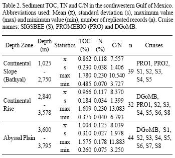 Distribution of total organic carbon and total nitrogen in deepsea sediments from the southwestern Gulf of Mexico