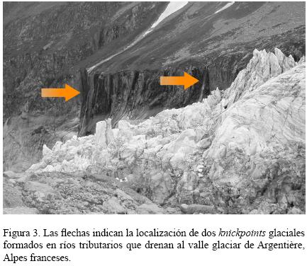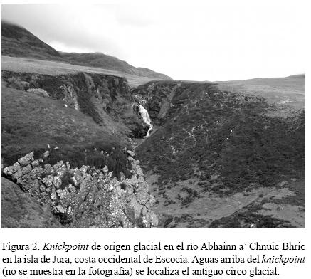 Otro proceso relacionado con la generación de knickpoints ocurre en las zonas cumbrales del relieve montañoso que antiguamente correspondían a la zona de circos glaciales; en el lecho de los mismos se produce un intenso pulimento, debido a la acumulación y movimiento del hielo que disminuye aguas abajo cuando no existen las condiciones necesarias para alimentar la lengua glacial. En el perfil longitudinal se distingue un área de fuerte concavidad cerca de la cabecera del río principal, el cual contrasta de forma drástica con un perfil recto localizado inmediatamente debajo del circo glacial; en está transición es frecuente encontrar el punto de ruptura o knickpoint (Figura 2; Figuras 1A y 1B en MacGregor et al., 2000; Figura 2 en Brocklehurst y Whipple, 2006). Una característica de los knickpoints generados por la acción glacial es una altura relativa del orden de la decena de metros y un escarpe frontal que excede valores de pendiente de 60 %.