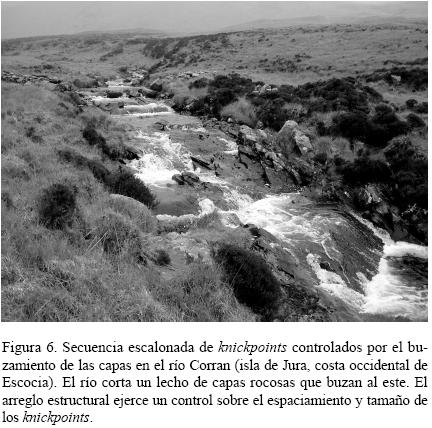 El control estructural con respecto a la formación de knickpoints fue expuesto por von Engeln (1940), para citar el caso de la incisión en estratos horizontales. Cuando hay una alternancia de capas de rocas débiles y resistentes, las pendientes del lecho son abruptas en las segundas, mientras que en las subyacentes se forman peldaños (Figura 5). Es un caso de control litológicoestructural como los relieves resultantes del modelado de una estructura monoclinal.