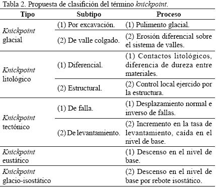 Debido a que las investigaciones geomorfológicas han identificado una serie de procesos que explican la presencia de knickpoints en el lecho fluvial (Figura 8), se propone aquí la inclusión del término knickpoint al léxico geológico y geomorfológico en español, en el cual se sugiere incluir como adjetivo calificativo el proceso generador, lo cual se apega al concepto de la morfogénesis, consistente en que las formas del relieve se definen por su aspecto (sustantivo) y su origen (adjetivo), como lo menciona Thornbury (1954). La propuesta de clasificación se presenta en la Tabla 2. Se propone aquí el uso del término knickpoint para denotar una expresión del desequilibrio del lecho fluvial.