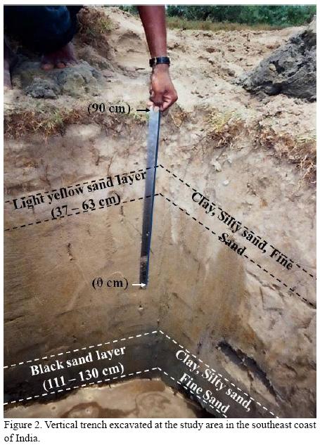 The present study documents the evidences of extreme wave events in the Velanganni coast in the southeastern part of India based on micropaleontological, sedimentological and mineralogical tools. The regional map (Figure 1) indicates the regions that were flooded during the 2004 December Indian Ocean tsunami as well as the areas that could possibly be inundated during high energy waves. As part of a larger investigation for high energy events, many studies have been initiated by the researchers of the Department of Geology from the University of Madras, Anna University and the Earth System Sciences Group in Chennai (India) all along the coastal regions in south India. Earlier studies in this region have already focused on the microfossil assemblages (Nagendra et al., 2005; Hussain et al., 2010). A 1.2 × 1.2 m vertical trench was excavated to identify the depositional sequence in this region where the mean sea level (m.s.l.) is almost equal to that of the present day sea level. In the litho-section, samples were selected based on the colour of the soil and grain size distribution (by direct eye observation). Overall, 12 sediment samples were collected at: 0-10 cm (loose sand with grass roots), 11-22 cm (red sand), 23-31 cm (white sand), 32-37 cm (light yellow sand), 38-63 cm (light yellow sand), 64-71 cm (coarse red sand), 72-81 cm (fine grained red sand), 82-93 cm (black sand), 94-99 cm (white sand), 100-111 cm (coarse river sand), 112-130 cm (black sand) and 131-135 cm (fine white sand) (Figure 2).