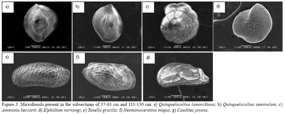 The samples were oven dried to 40 °C and used for the identification of foraminifera and ostracod species. The microfossils were subsequently photographed using a scanning electron microscope (JEOL-JSM 6360). Likewise, heavy minerals were identified after the sample was sieved and separated using bromoform. Microfossils were subsequently identified under an optical microscope to obtain the total abundance in each sample (Milner, 1962a, 1962b). Granulometric analysis suggested the presence of dominant sand size sediment.