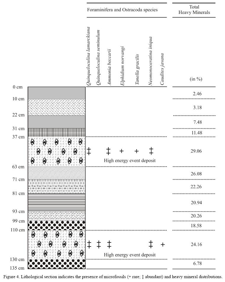 Our results clearly suggest that the sediment present at depths of 37-63 cm and 111-130 cm represent two different phases of deposition during/after extreme wave events, where the sediment, heavy minerals assemblage and the microfossils are transported to the continental region and deposited subsequently. However, more studies are also needed in this region to ascertain the exact provenance of the sediment and further radiometric dating is required to know the age of these deposits.