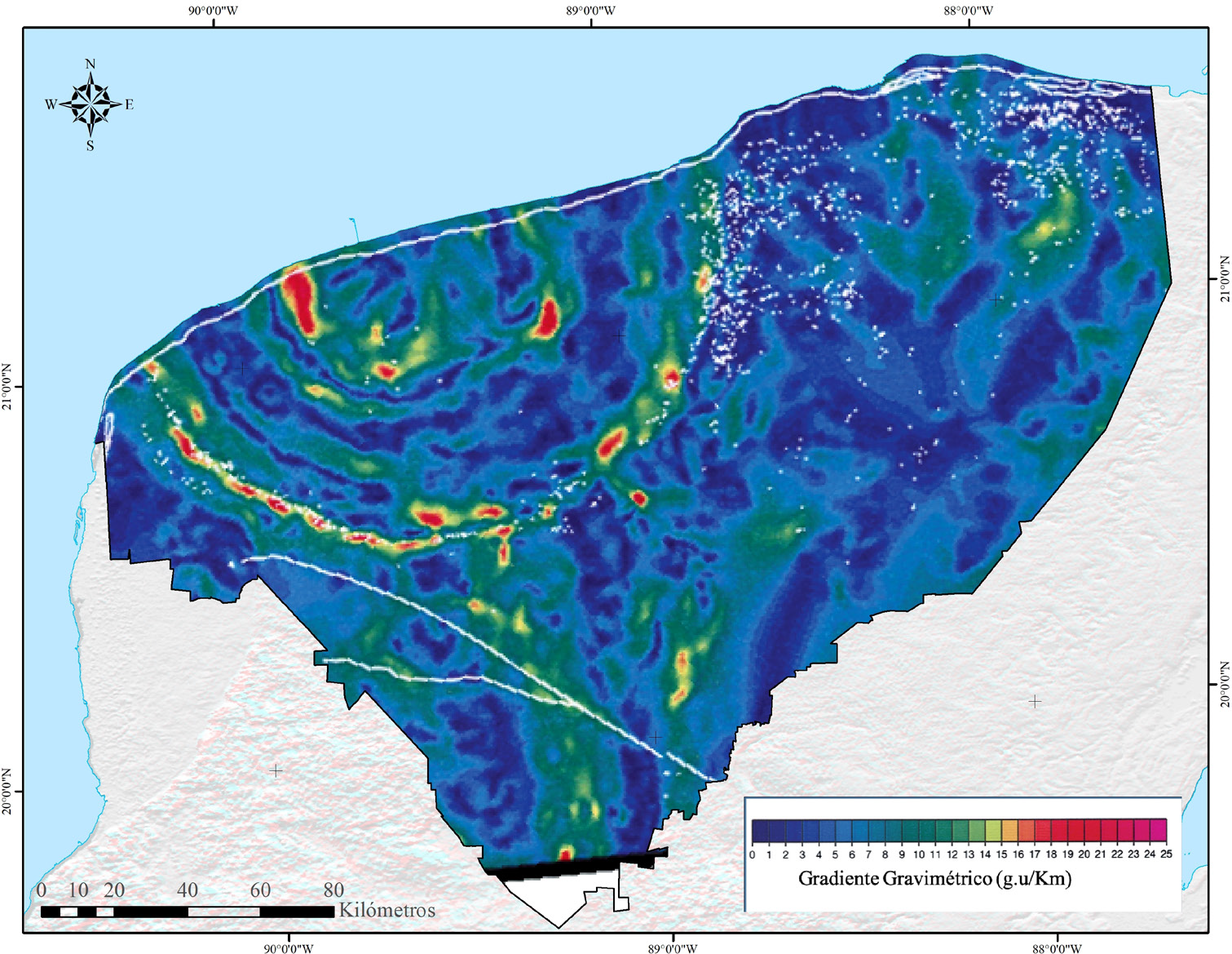 En este caso en particular, el estudio incorpora el mapa de anomalías gravimétricas de Bouguer, en donde las diferencias de densidad de las rocas subyacentes conllevan a generar incrementos en la conductividad hidráulica de algunas áreas del relieve kárstico, siendo ésta una característica particular regional del cráter multianillos de Chicxulub, sometido a largo plazo a cierto tipo de clima, seco o subhúmedo, con fuertes o ligeras oscilaciones de temperatura. El humedecimiento favorece los procesos de disolución de la roca calcárea, las diferencias fuertes de temperatura pueden intemperizar y resquebrajar la capa de caliche superficial, favoreciendo la infiltración.
