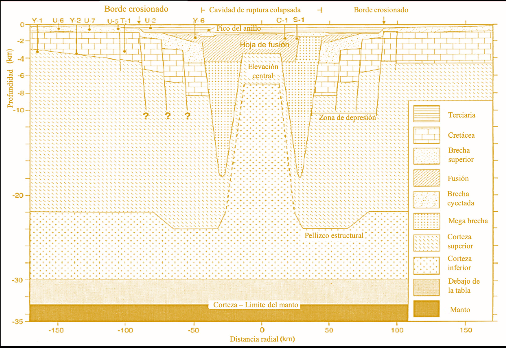 Figura 2 Modelo estructural del Cráter de Chicxulub, exagerando la línea vertical y mostrando los pozos S-I, Sacapuc; C-I, Chicxulub-1; Y-6, Yucatán-6; U-2, UNAM; -2; T-I, Ticul-I; U-5, UNAM-5; U-7, UNAM-7; Y-2, Yucatán-2; U-6, UNAM-6; Y-1, Yucatán-1. (modificada de Urrutia-Fucugauchi et al., 2011).