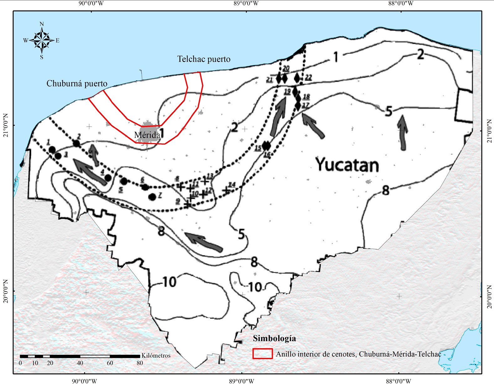 De acuerdo con Pérez-Ceballos et al., (2012), el Anillo de Cenotes concentra y conduce el agua subterránea hacia la costa de Celestún, al poniente, y Dzilam, por el oriente, por lo que entender y conocer la influencia del agua subterránea en la zona costera es de gran importancia. Hacia el sur de la entidad, el drenaje es mínimo y desaparece en resumideros o en cuerpos de agua superficial llamados aguadas. En la parte norte, la descarga de esta agua se realiza por medio de manantiales y en forma difusa hacia el mar, alimentando las ciénagas y lagunas costeras. Los autores realizaron un estudio de modelación inversa que permitió cuantificar los minerales y su comportamiento en temporada de secas, lluvias y nortes. En la Figura 3 se muestra la ubicación de los diversos cenotes estudiados.