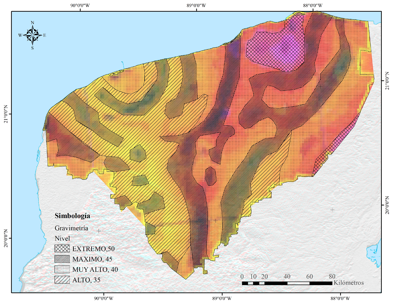 De igual manera, el reflejo de la caracterización kárstica vinculado con zonas de alto flujo hidráulico por conductos preferenciales descritas en el método IVAKY como dolinas agrupadas, refiriéndose al Anillo de Cenotes, guarda relación con el método gravimétrico para definir y detallar este contexto. Debido al sistema multianillos del Cráter de Chicxulub y de otros procesos kársticos, se presentan como oleadas concéntricas de vulnerabilidad muy alta y extrema en la dirección sureste-noroeste, alineadas con densidades de roca diferenciales y flujos preferenciales. Estas oleadas concéntricas de muy alta y extrema vulnerabilidad se extienden sobre un gradiente que va desde vulnerabilidad extrema al sureste del estado a vulnerabilidad muy alta, alta y media, al noroeste, cubriendo muy bien los factores edáficos, humedad de suelo y climáticos principalmente, descritos en el método IVAKY.