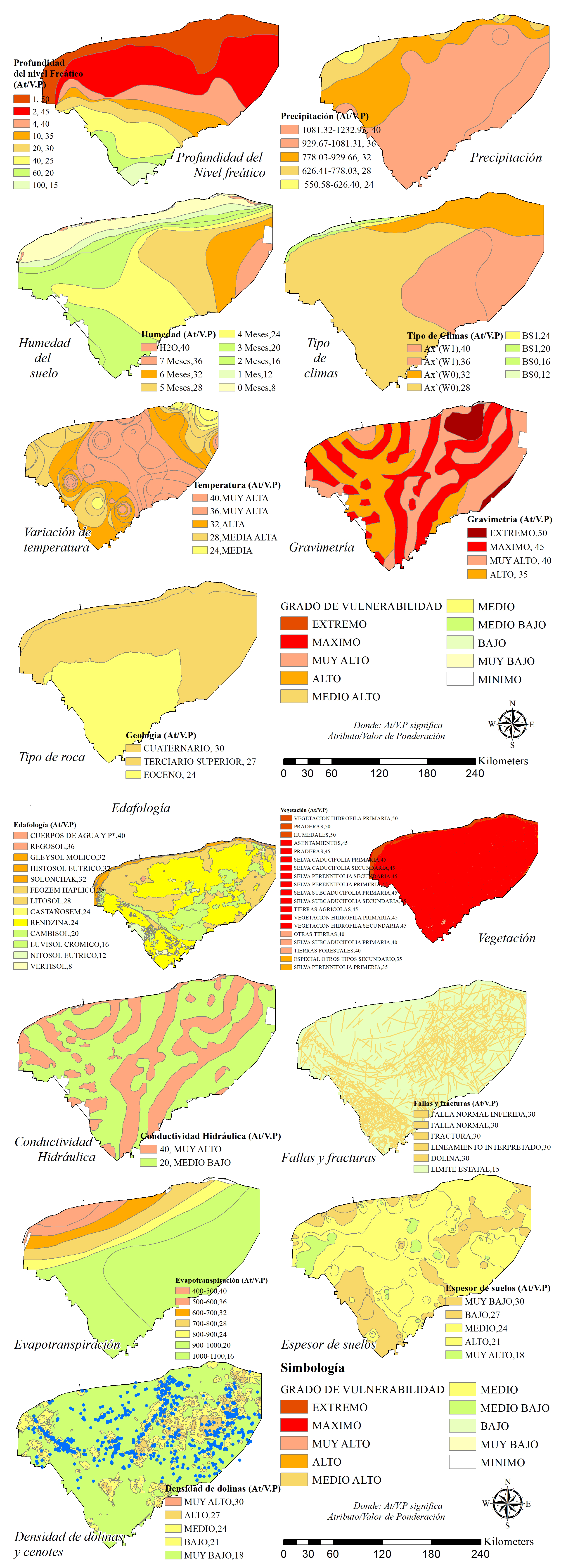 En este estudio se tomaron en cuenta las variables de los modelos DRASTIC utilizadas por Arcega (2018), excepto las variables de dureza del agua y topografía, pues resultan muy homogéneas, así como aquellas utilizadas en el método EPIK, en cuanto a las características del relieve kárstico, como la densidad de dolinas, presencia de depresiones húmedas (cenotes).