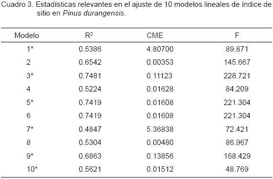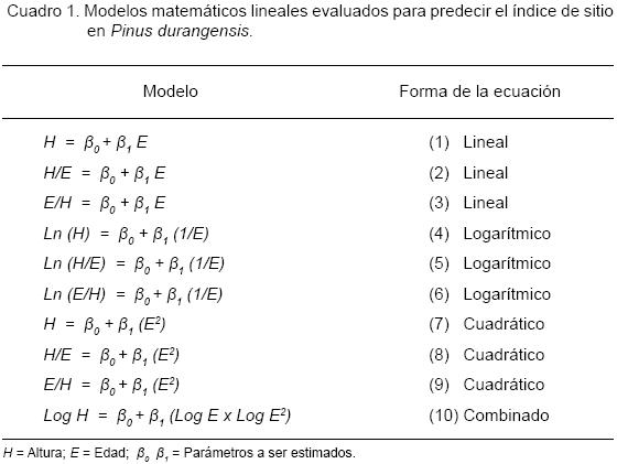 En el Cuadro 1 se ordena la forma de los 10 modelos matemáticos lineales probados para predecir el índice de sitio en Pinus durangensis, que fueron ajustados mediante el paquete estadístico SAS a través del Método de Cuadrados Mínimos.