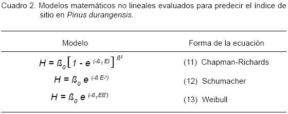 En el Cuadro 2 se muestra la forma de los tres modelos matemáticos no lineales probados para predecir el índice de sitio para Pinus durangensis, mismos que fueron ajustados mediante el procedimiento NLIN del paquete estadístico SAS, mediante el método DUD.