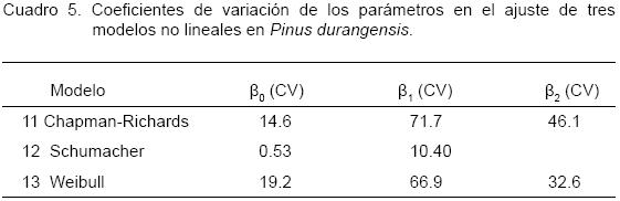Se resumen los estadísticos de los parámetros para los modelos no lineales los cuales indican la tendencia con respecto a la ordenada al origen, y la pendiente de las curvas de ajuste y la forma de distribución en los datos originales. Para estos modelos no lineales es importante hacer un análisis del parámetro β1 dado que define la proyección de la curva de ajuste en el diagrama de dispersión original además de que β0 marca la tendencia de desplazamiento de la curva de ajuste. Una manera más exacta para decidir sobre el mejor modelo no lineal de índice de sitio, es a través del coeficiente de variación (CV) del parámetro.