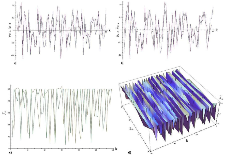 Para el caso m = 2, la figura 2 muestra separadamente cada una de las componentes del sistema. La figura 2a) muestra en azul la primera señal observable, y11k, y en rojo la primera identificación yˆ11k.