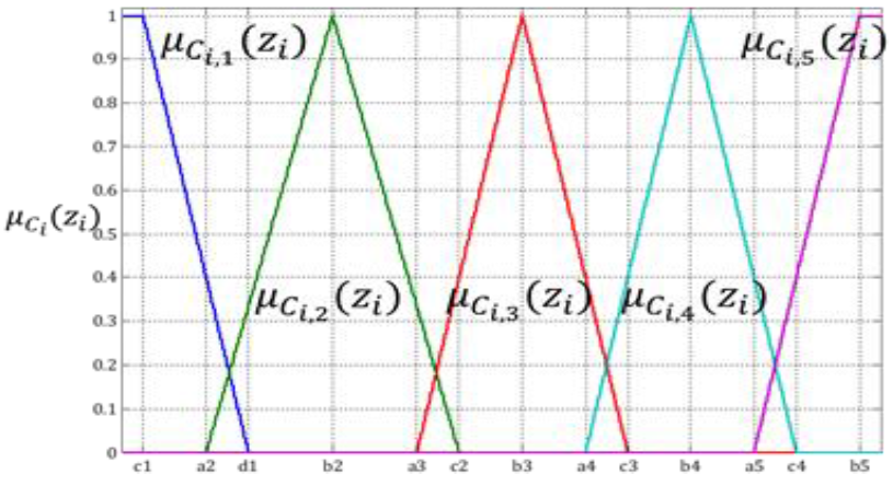 Se plantean los criterios difusos C~i=1,2,,I. Donde C~i es el conjunto de los valores de membresía μCi,jzj=1,2,,J dado un valor medido o calculado z para el criterio Ci como se muestra en (5)-(9). Donde zZi y Zi es el universo de discurso del criterio Ci descrito en [23]: