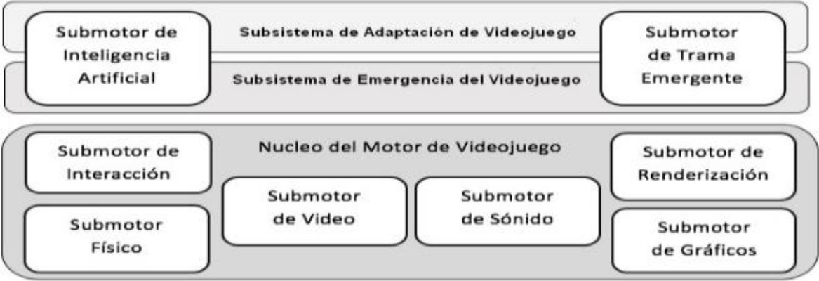 • — Subsistemas de Emergencia del Videojuego (SEV) y de Adaptación del Videojuego (SAV): los cuales son las capas de la arquitectura MJSE que permiten hacer emerger un JSE. En específico, ambos subsistemas usan los siguientes submotores: