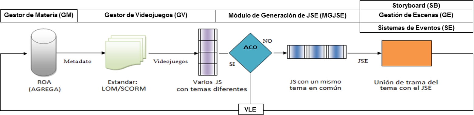 • — Gestor de Videojuegos (GV): busca en repositorios de videojuegos (por ejemplo, edugame, advergame, etc.), subtramas o videojuegos para esa temática. Dichas subtramas/videojuegos son definidos como Recursos de Aprendizaje (RA). Para la búsqueda, compara los metadatos de los Ras en los repositorios con el definido por el GM. Si no consigue al menos un videojuego parecido a lo buscado, llama al módulo siguiente.
