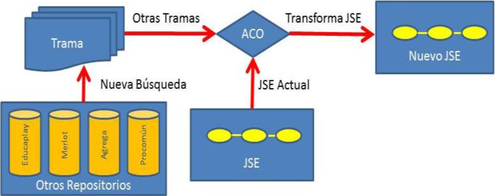 • — Módulo de Generación de JSE (MGJSE): es el responsable del ensamblaje de un nuevo JSE usando las subtramas provistas por el GV. En un trabajo previo, se ha definido el MGJSE basado en ACO [6]. El MGJSE tiene imbricadas las funciones de los siguientes tres componentes del SEV, para generar inicialmente un JSE.