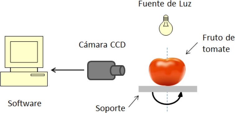 En la figura 2, se presenta el sistema implementado el cual consiste en un dispositivo que permite rotar el fruto de tomate de 0° a 360°. La cámara (marca PHILIPS PCVC830K/30 con tamaño de imagen de 352x288 pixeles) es posicionada frente al soporte donde se coloca el fruto.